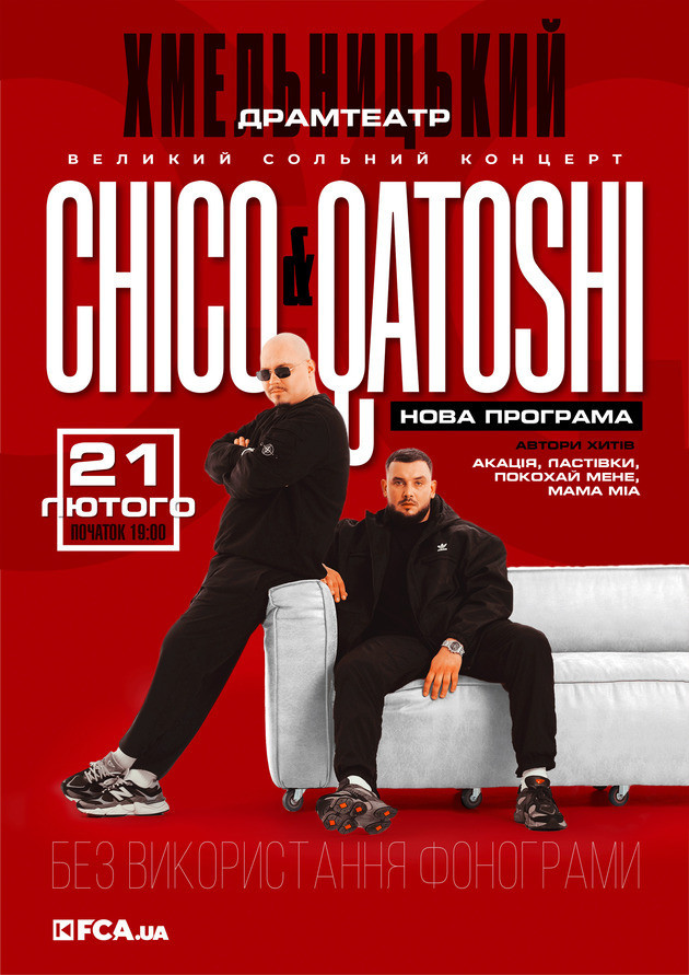 Вже зовсім скоро Chico & Qatoshi дають свій сольний концерт у вашом місті, де разом з вами заспівають улюблені хіти та нові пісні.