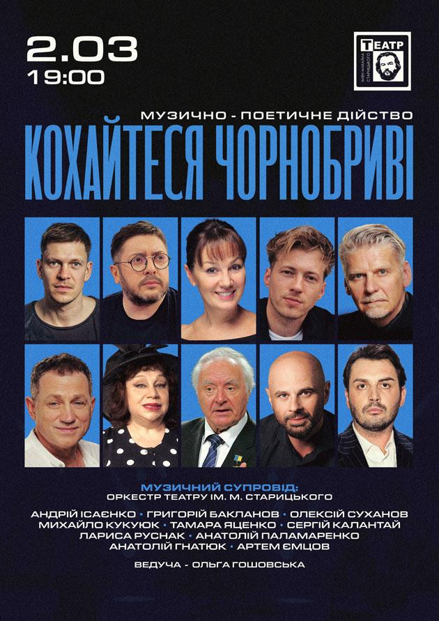 У березні глядачів шести міст України чекає особлива мистецька подія — музично-поетичне дійство “Кохайтеся, чорнобриві”, яке поєднує в собі живе слово української класики, театральну емоцію та величне звучання оркестру.